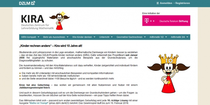 Die Kira-Materialien helfen, sie zielgerichtet und individuell fördern und fordern zu können – und das mit Erfolg: mehr als 150 lehrerbildende Institutionen nutzen die Seite, mehr als 1100 Besuche verzeichnet kira.dzlm.de mit seinen über 60 Unterseiten täglich.